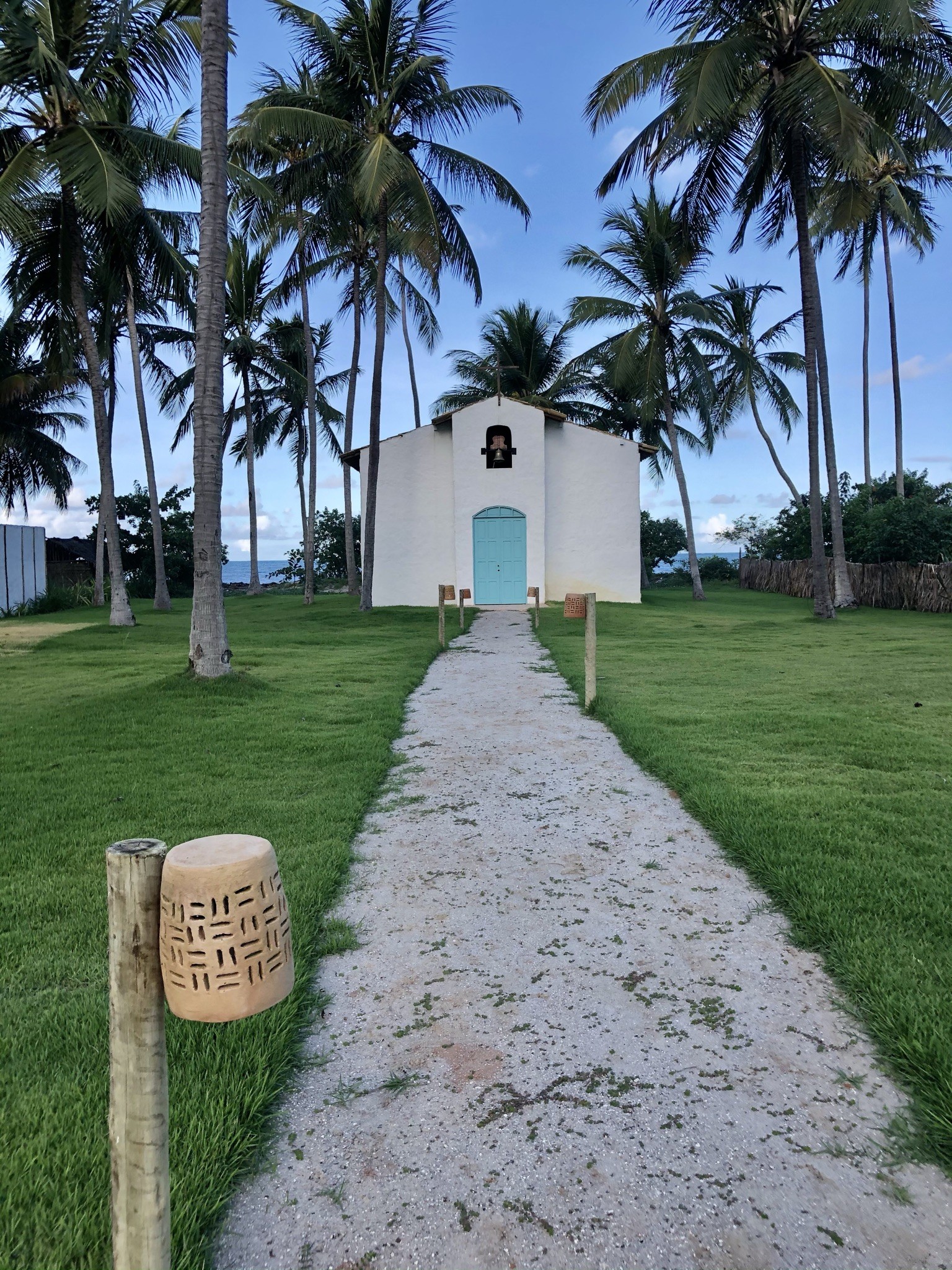 Mar cristalino. Areia branca. Falésias ao fundo.