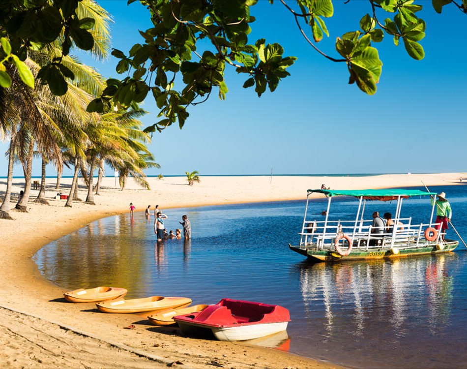 Chegar à praia é parte da aventura: você pode atravessar o rio em uma chalana (taxa de travessia não inclusa) ou caminhar pelo cenário natural de pedras e dunas.