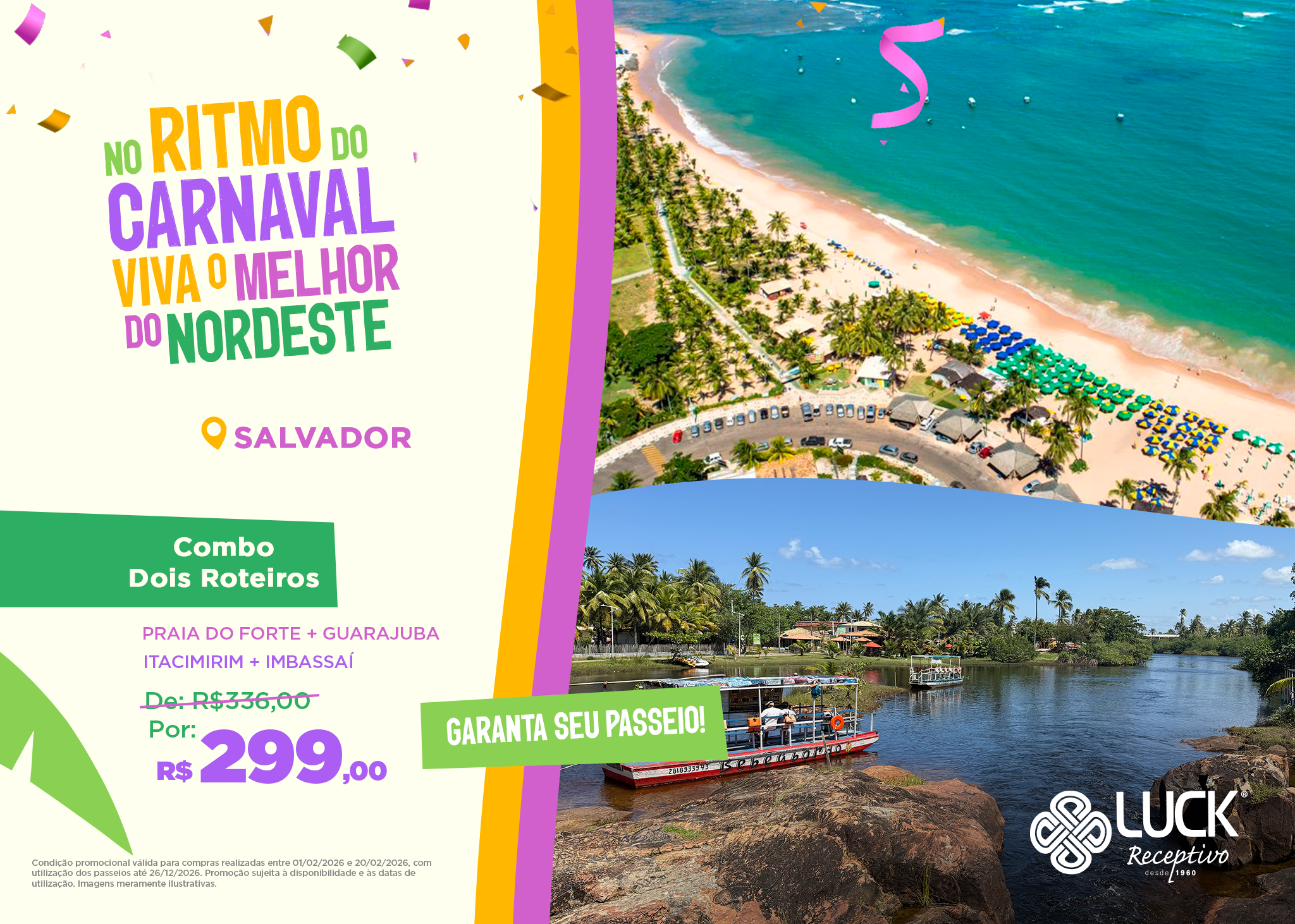 Descubra os encantos da Bahia! Monte o seu próprio roteiro e viva o melhor do estado no seu ritmo. O pacote inclui 2 passeios à sua escolha para explorar praias, cultura e paisagens que fazem da Bahia um destino inesquecível.